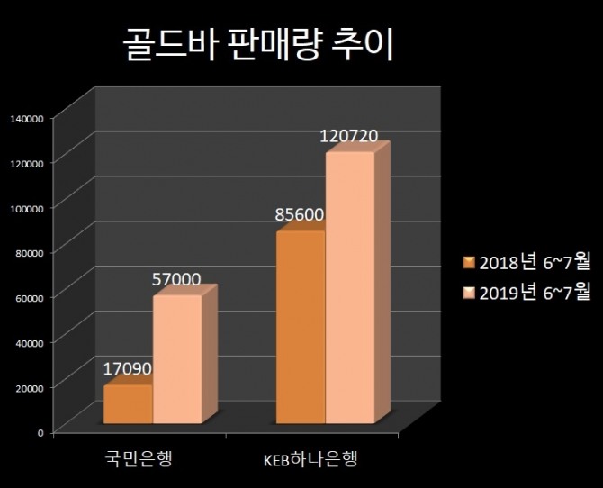 KEB하나은행은 올해 6~7월 12만720g의 골드바를 판매했다. 지난해 같은 기간 판매량(8만5600g)에 비해41% 늘었다.