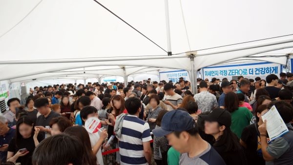 오포 더샵 센트럴포레 견본주택 내부 대기줄. 사진=포스코건설