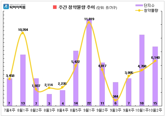 이미지 확대보기5일 부동산 리서치회사 닥터아파트에 따르면, 10월 둘째주(10월 7~12일) 청약물량은 전국 15곳 6140가구이다. 견본주택은 15곳이 문을 열 예정이며, 당첨자 발표는 14곳, 당첨자 계약은 8곳이다.