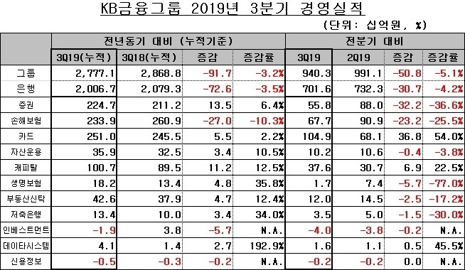 KB금융의 3분기 누적 당기순이익은 2조7771억 원으로 전년동기 대비 3.2% 감소했다. 이는 지난해 은행 명동사옥 매각익 소멸과 올해 희망퇴직에 따른 비용 인식 등에 주로 기인하며 이러한 일회성 요인을 제외한 경상적 기준으로는 전년동기 대비 소폭 증가한 실적이다.