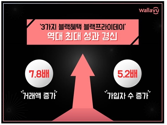 이미지 확대보기V커머스 뷰티플랫폼 왈라뷰(wallaVU)가 지난 18일부터 20일까지 사흘간 진행한 ‘3가지블랙혜택, 블랙프라이데이(블프)’ 프로모션이 폭발적 매출 성장세로 화제다.