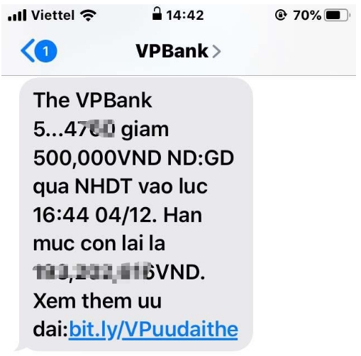 지난 4일 하노이에 거주하는 한 여성은 VP뱅크를 가장한 피싱사이트에 속아 2분 만에 18건의 거래로 4억6000만 동의 사기를 당했다. 늦은 오후 그녀는 당첨 메시지를 받고 'SAN SO LOC VANG'라는 곳에서 저축 도서에 당첨됐으니 웹 사이트 (http : //trian.bank-)에 대한 액세스를 요청받았다.