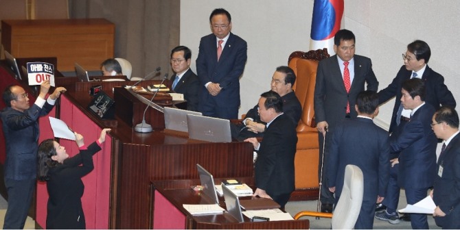 당초 공직선거법 개정안은 27번째 안건이었으나 문 의장은 예산 부수법안을 2건을 처리한 뒤 자유한국당의 반대 속에서 표결을 거쳐 의사 일정을 바꿨다.