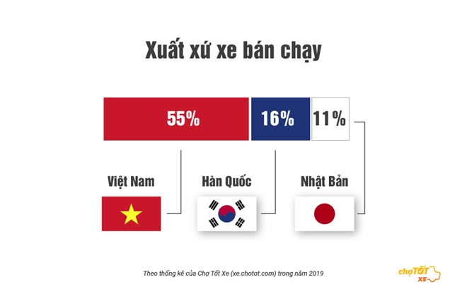 6일(현지시간) 베트남 현지매체 등은 자동차관련 웹사이트 조 똣 세(Cho Tot Xe)의 2019년 통계를 인용해 베트남 산 중고차가 가장 인기가 많으며 전체 시장에서 55%를 차지하고 있다고 보도했다. 그 뒤를 이어 구매자의 16%는 한국에서 중고차를 구매하기로 선택했고 11%는 일본에서 중고차를 구매하기로 결정했다.
