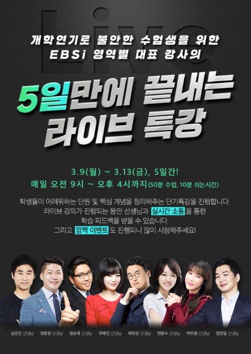 이미지 확대보기EBS 스타 강사가 총출동하는 'EBSi 라이브 특강'은 EBSi 고교 사이트(www.ebsi.co.kr)를 통해 서비스되며, 오는 9일부터 13일까지 아침 9시부터 오후 4시까지 진행된다.