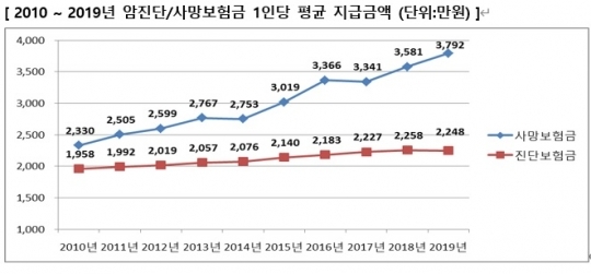 암에 대한 국가 보장이 강화되면서 고객들이 진단보험금 대신 사망보험금을 늘리는 방향으로 암 보험을 설계하면서 1인당 평균 암 진단보험금은 2010년 1958만 원에서 지난해 2248만 원으로 15% 증가하는데 그쳤다.