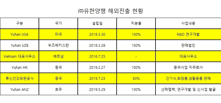 2016년 베트남에 현지사무소를 세운 유한양행의 해외진출은 2018년부터 본격화 됐다. 2018년 판매법인 유한우즈베키스탄을 설립해 중앙아시아 공략에 나섰고, R&D를 위해 미국에도 진출했다.