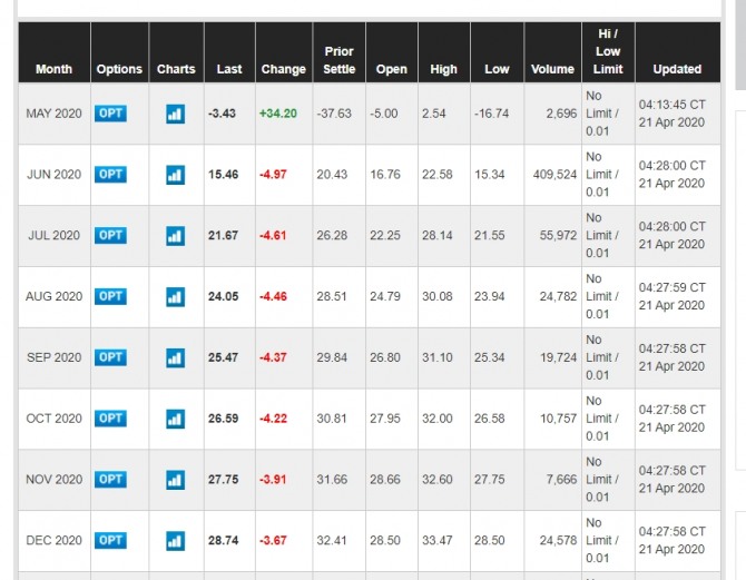 21일 뉴욕증시와 시카고선물거래소에 따르면 미국의 주종 원유인 WTI Crude Oil (Nymex) 5월물은 이 시각 현재 배럴당 USD/bbl. -3.43 달러를 지나고 있다. 전일 대비 +34.20 달러 비율로는 무려 +90.88% 오른 것이다. (WTI Crude Oil (Nymex) USD/bbl. -3.43 +34.20 +90.88% May 2020 5:13 AM) WTI Crude Oil (Nymex) 5월물은 그럼에도 여전히 마니어스에서 헤어나지 못하고 있다. WTI Crude Oil (Nymex) 5월물은 이 날로 종료된다. 그런만큼 국제유가 지표로서의 의미는 사실상 없다.