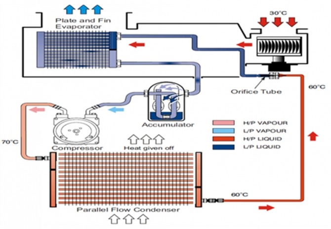 R1234yf 냉매는 R134a 냉매와 비교적 비슷한 열역학적 특성을 가지고 있으나, 동일한 포화온도에서 R1234yf 냉매가 R134a 냉매와 비교하여 증발잠열이 작다. 이는 R1234yf 냉매를 적용한 시스템에서 R134a와 동일한 냉방성능을 내기 위해서는 시스템 개선이 필요한 부분으로 이를 위하여 제조사 에서는 응축기출구와 증발기출구의 냉매가 서로 열 교환이 이루어지도록 내부열교환기를 설치하여 응축기 출구에서 과도한 냉매 현상을 방지하고 증발기에서 냉방성능을 향상시켜준다.