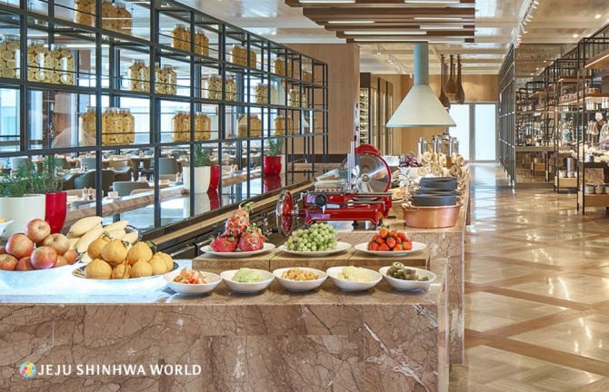 조식은 인터내셔널 클래스의 호텔 뷔페로 제공되며 석식은 정통 중식당 르 쉬느아, 정갈한 제주 한정식의 제주선, 최고의 뷰와 함께하는 스테이크하우스 스카이온 파이브 다이닝 중 선택 가능하다.