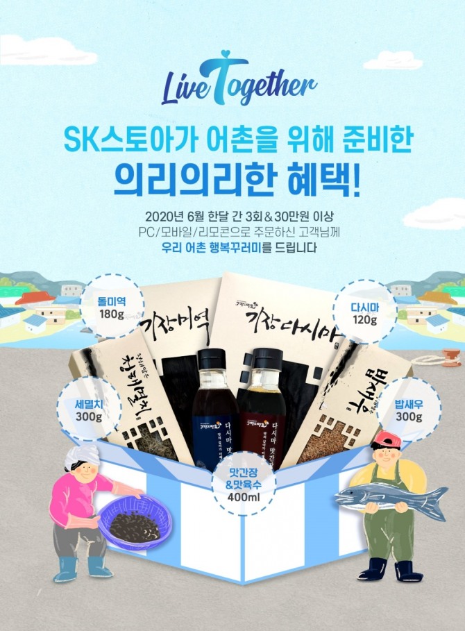 이미지 확대보기Live Together는 SK스토아 상품 총 결제액이 30만 원 이상(3회 이상 구매)인 고객에게 6만 원 상당의 ‘우리 어촌 행복 꾸러미’를 제공하는 행사다.