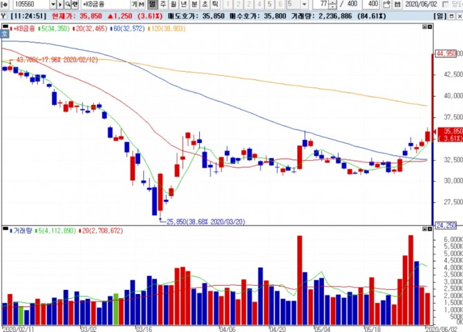 이날 11시 현재 KB금융지주는 전일대비 3.61% 상승한 3만5850원에 거래중이다.