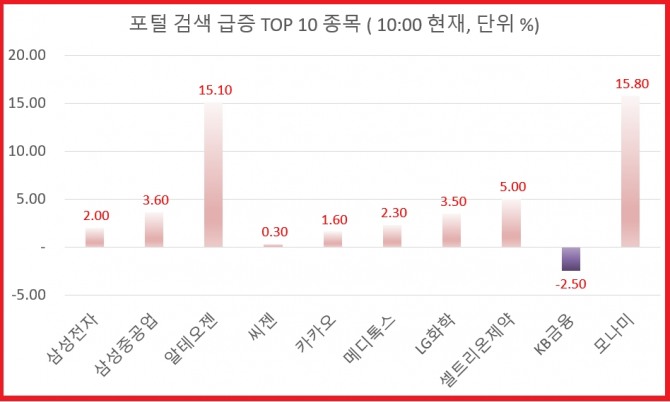 이미지 확대보기오전 10시 현재 검색량 기준 상위 종목으로는 삼성전자, 삼성중공업, 알테오젠, 씨젠, 카카오 순이다.