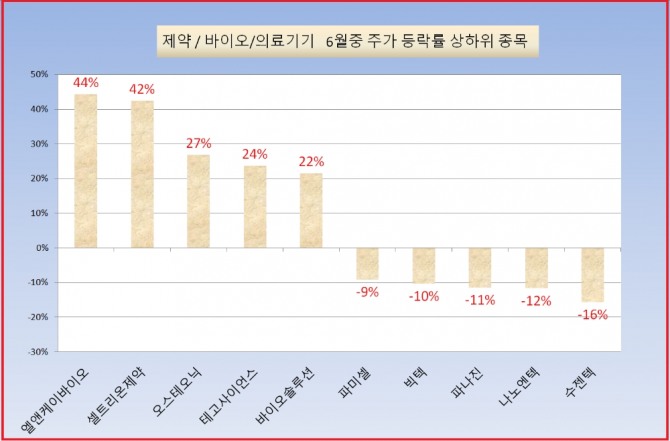 6월중 코스피, 코스닥 제약종목과 의료기기 종목의 등락율 순위는 다음과 같다.