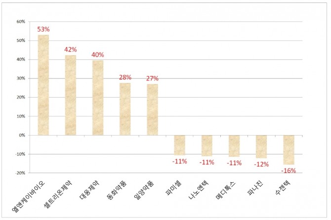 엘앤케이바이오 8340원 (53.03%), 셀트리온제약 130500원 (42.31%), 대웅제약 143000원 (39.51%), 동화약품 14750원 (27.71%), 일양약품 61000원 (27.08%), 제테마 40900원 (26.43%), 바이오솔루션 29850원 (25.16%), 오스테오닉 4260원 (23.12%), 옵티팜 15150원 (22.18%), 앱클론 58400원 (21.41%),