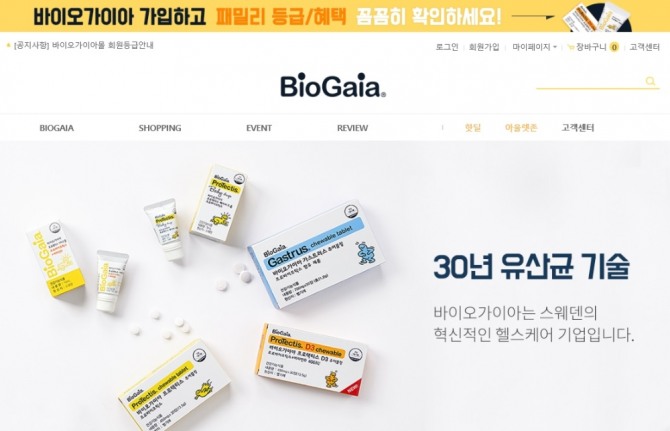 한편 동성제약은 탄생 30주년을 맞이한 ‘바이오가이아’의 공식 온라인 쇼핑몰 오픈을 기념해 다양한 이벤트를 진행 중이다. 쇼핑몰에서 처음 구매한 모든 고객에게는 20% 할인쿠폰이 발급된다. 또한 6월 21일까지 쇼핑몰에 포토 후기를 남긴 고객에게 마일리지 3,000점이 적립되며, 그 중 10명을 추첨하여 ‘바이오가이아 가스트러스 츄어블정’ 30일분을 추가로 증정한다.