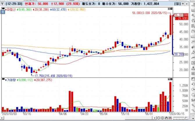 바이오 기업 파맵신이 15일 오전 무상증자를 발표한후 상한가를 기록하고 있다.  사진=NH투자증권 HTS 파맵신 주가 차트이미지 확대보기