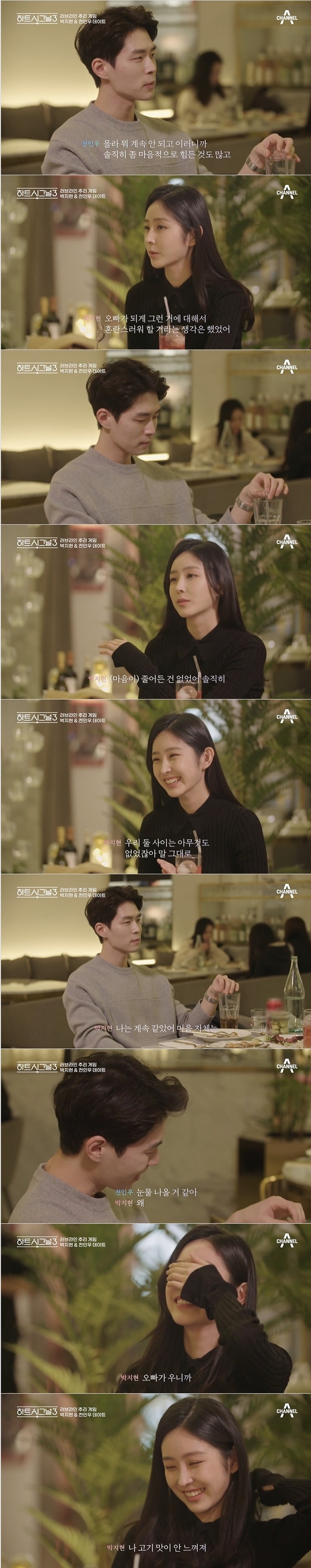 17일 방송된 채널A 러브라인 추리게임 '하트시그널 시즌3' 12회에는 천인우와 박지현이 어렵게 데이트를 하며 솔직한 속내를 밝혀 심쿵을 선사했다. 사진=채널A 방송 캡처 이미지 확대보기