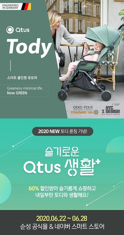 이미지 확대보기독일 유모차 브랜드 ‘큐터스’가 절충형 유모차 토디(Tody)의 그린 컬러 출시를 기념해 순성몰과 순성 네이버 스마트스토어에서 6월 22일부터 28일까지 큐터스 제품과 듀클 유모차 액세서리를 최대 60% 할인하는 행사를 진행한다고 밝혔다.