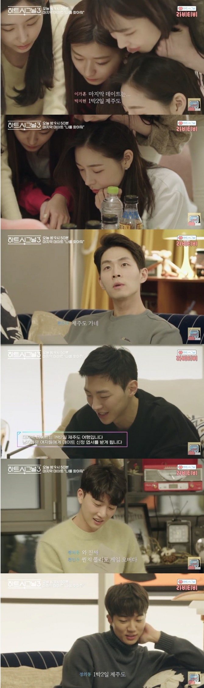 24일 방송되는 채널A 러브라인 추리게임 '하트시그널 시즌3' 13회에는 박지현과 천인우, 김강열, 이가흔 등 입주자 8명이 마지막 데이트로 제주도에서 1박2일 데이트를 하는 모습이 그려진다. 사진=채널 A 영상 캡처 이미지 확대보기
