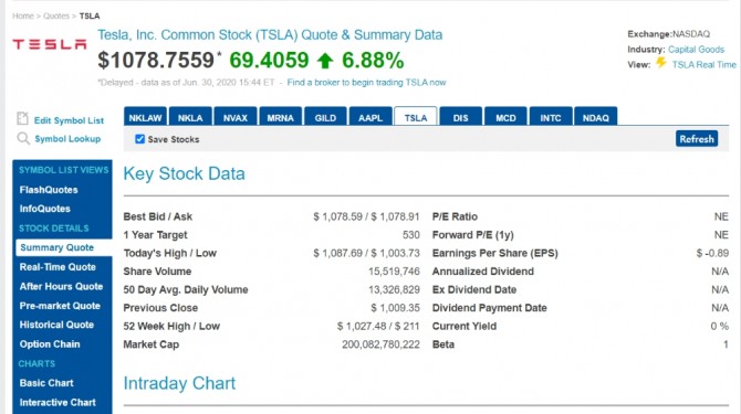 1일 뉴욕증시에 따르면 테슬라 주가는1 주당 $1078.75 달러로 마감했다. 전일대비 6.88% 오른것이다. 테슬라 주식은 앞소 30일 아침에도 1009.35달러를 기록했다. 테슬라 주가는 올들어 150% 폭등했다. 테슬라의 시가총액이 대표적인 자동치회사인 토요타도 넘어섰다.