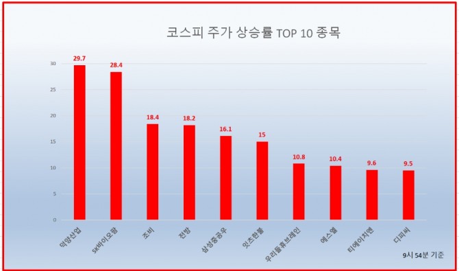 1위 덕양산업, 1635원 ( 29.76% ) , 2위 SK바이오팜, 212000원 ( 28.48% ) , 3위 조비, 22500원 ( 18.42% ) , 4위 전방, 24000원 ( 18.23% ) , 5위 삼성중공우, 364000원 ( 16.11% ) , 6위 잇츠한불, 20600원 ( 15.08% ) , 7위 우리들휴브레인, 3625원 ( 10.86% ) , 8위 에스엘, 12150원 ( 10.45% ) , 9위 티에이치엔, 2850원 ( 9.62% ) , 10위 디피씨, 12650원 ( 9.52% )