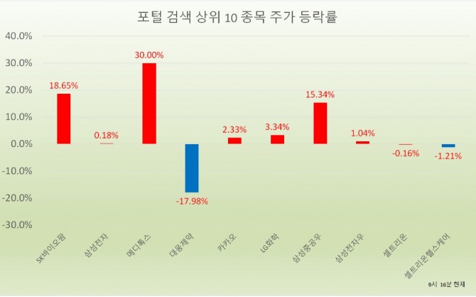 이날 오전 9시 16분 현재 포털사가 집계하는 검색량 기준 상위 20개 종목의 현황은 다음과 같다.