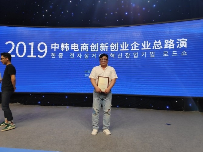 ㈜아이미마인의 ‘SizeMine’이 주목을 받고 있다. 이 업체 박익수대표가 중국에서 열린 '한중 전자상거래 헉신창업기업 로드쇼'에 참석해 기념촬영을 하고 있다. 사진=아이미마인