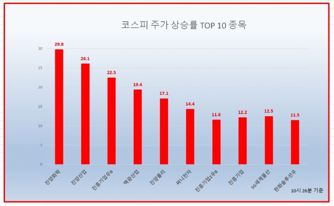 이미지 확대보기10시 26분 현재 코스피 상승률 상위 20개 종목은 다음과 같다.