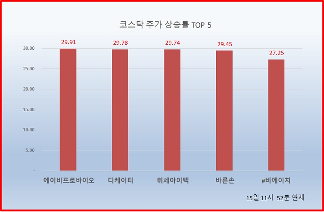 15일 코스닥 시장이 소폭 상승한 가운데 에이비프로바이오, 디케이티, 위세아이텍, 바른손 등이 상한가를 기록해 눈길을 끌고 있다.