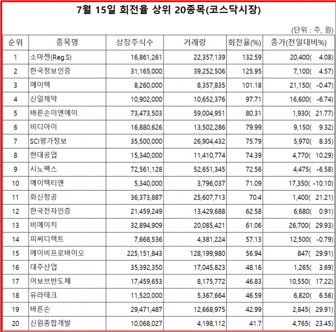 15일 증권시장에서 코스닥 종목의 거래량 회전율 기준 상위 종목은 다음과 같다.