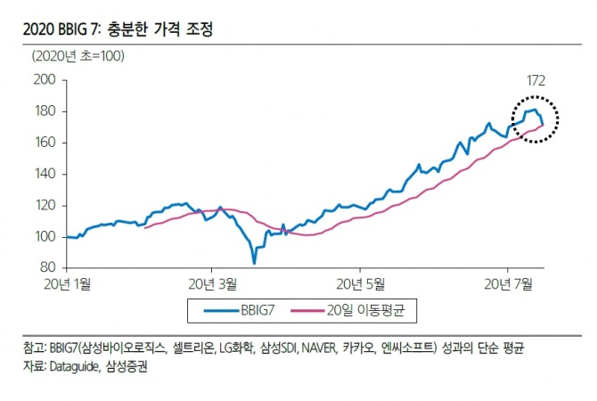 삼성증권은 18일 BBIG 7 주도주들이 지난 한 주 충분히 가격 조정을 받았지만, 흔들릴 필요없이 이번 조정 구간에 주도주에 대한 비중을 높여볼 것을 제안했다.