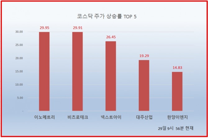1위 이노메트리 24300원 ( 29.95% ), 2위 비츠로테크 10250원 ( 29.91% ), 3위 넥스트아이 1530원 ( 26.45% ), 4위 대주산업 2195원 ( 19.29% ), 5위 한양이엔지 12000원 ( 14.83% ), 6위 오스템 2580원 ( 15.7% ), 7위 제테마 23600원 ( 14.29% ), 8위 에버다임 4865원 ( 14.47% ), 9위 제놀루션 25900원 ( 13.6% ), 10위 레드캡투어 15000원 ( 12.36% ),