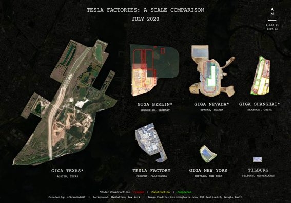 이미지 확대보기29일(이하 현지시간) 전기차 전문매체 테슬라라티에 따르면 테슬라 인터넷 커뮤니티에서 u/brandude87이라는 아이디를 사용하는 테슬라 모델 3 차주는 지금까지 지어진 기가팩토리들과 오스틴에 지어질 기가팩토리5의 부지 규모를 비교한 그림을 올렸다. 이 비교 그림에 따르면 기가팩토리5는 테슬라가 지금까지 지은 공장들과는 비교가 어려울 정도로 크다.