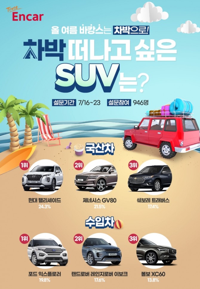 이에 따라 중고차 거래 플랫폼 엔카닷컴이 지난 16일부터 23일까지 946명을 대상으로 ‘이번 여름 차박 떠나고 싶은 SUV’를 설문 조사한 결과 팰리세이드가 24.3%의 선택을 받으며 국산 SUV 중 1위에 올랐다.