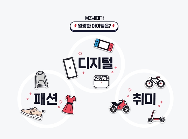 MZ세대의 거래가 가장 빈번했던 카테고리는 다꾸, 스타 굿즈, 피규어 등 ‘취향’과 ‘덕질’을 포함하는 영역이었다. 가장 최다 거래를 보인 분야는 문구·필기류였다. 본인의 다이어리를 꾸미기 위한 문구류와 인쇄스티커, 메모지 등 개성을 아날로그 형태로 표출하는 다양한 트렌드성 물품이 포함됐다. 거래량 2위는 방탄소년단 중심으로 남자 아이돌그룹 굿즈 제품이 전년 동기 대비 32% 증가하는 성장세를 보였다. 피규어, 인형, 이어폰 등 카테코리도 상위권이었다.