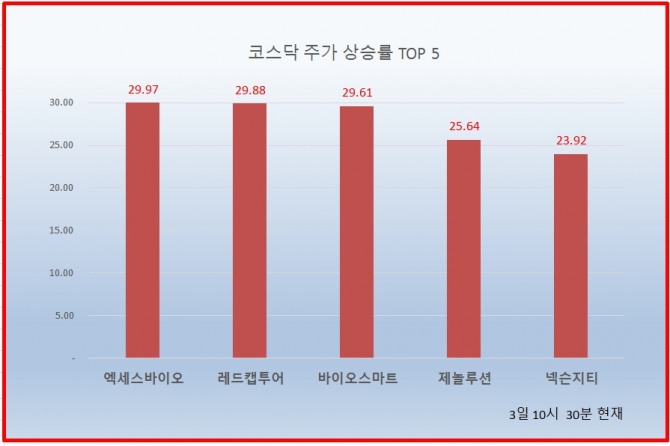 3일 10시 30분 현재 코스닥 상승률 상위 50개 종목은 다음과 같다.