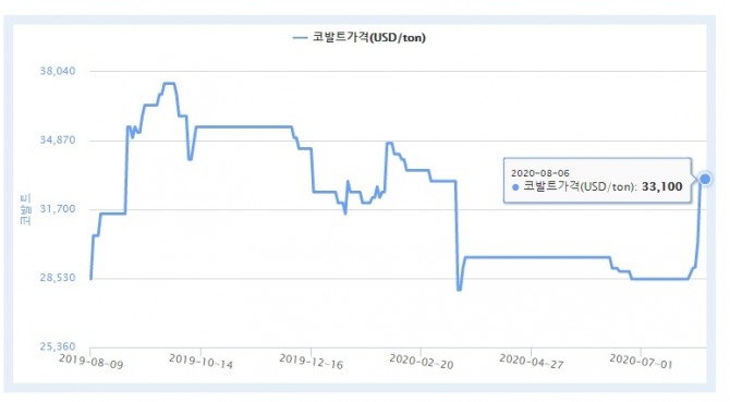 LME에서 코발트 금속 가격은 지난 3월 t당 2만8000달러까지 떨어졌으나 이후 하향 횡보하다 지난달 28일 2만8500달러에서 지난 6일 3만31000달러로 불과 일주일여 사이에 15% 이상 상승하면서 3월 이후 최고가를 찍었다.