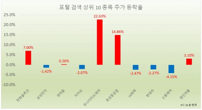 오전 9시 20분 현재 포털사가 집계하는 검색량 기준 상위 20개 종목의 현황은 다음과 같다.