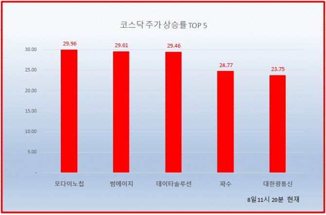 이미지 확대보기데이타솔루션은 한국판 뉴딜정책 수혜주로, 모다이노칩은 5G관련주로, 썸에이지는 게임 관련주 각각 강세를 보이고 있다.