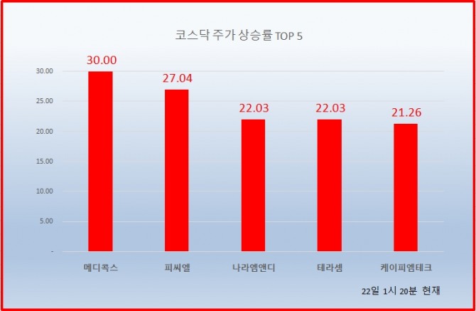 21위 이즈미디어 4045원 ( 8.16% ), 22위 맥스로텍 2495원 ( 7.54% ), 23위 YBM넷 9360원 ( 7.22% ), 24위 코닉글로리 3695원 ( 7.1% ), 25위 엑시콘 12150원 ( 6.58% ), 26위 이엑스티 3605원 ( 6.34% ), 27위 대한약품 33200원 ( 6.24% ), 28위 진매트릭스 16700원 ( 6.03% ), 29위 앤디포스 8280원 ( 5.75% ), 30위 쎄미시스코 8950원 ( 5.42% )