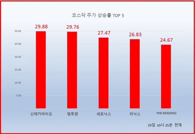 1위 신테카바이오 38900원 ( 29.88% ), 2위 엠투엔 13300원 ( 29.76% ), 3위 새로닉스 6310원 ( 27.47% ), 4위 라닉스 10400원 ( 26.83% ), 5위 THE MIDONG 3285원 ( 24.67% ), 6위 모바일어플라이언스 5420원 ( 21.12% ), 7위 마이더스AI 756원 ( 18.68% ), 8위 인지디스플레 2925원 ( 16.53% ), 9위 이라이콤 11300원 ( 16.98% ), 10위#텔콘RF제약 8370원 ( 14.97% ),