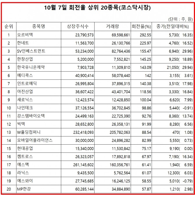 7일 증권시장에서 코스닥 종목의 거래량 회전율 기준 상위 종목은 다음과 같다.