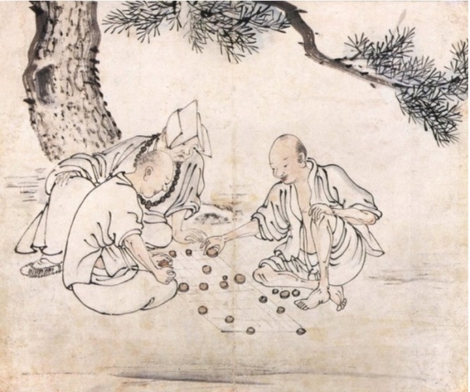우리는 옛 그림을 통해서 어느 스님이 거의 이겼는지 쉽게 짐작할 수 있다. 저고리 끈을 풀어헤치고 정강이를 다 드러내면서 만면에 미소를 짓고 있는 화면 오른쪽 스님이 거의 승기(勝氣)를 잡았음이다. 반면에 맞은편 스님은 심각한 얼굴로 반전을 짜내느라 정신을 집중하는 중이다. 다시 고깔 쓴 스님을 보자면 금방이라도 “헛, 그, 참”을 연발하는 눈빛인데 언제부터 그랬던 것일까.