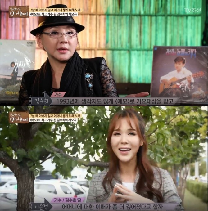 '인생다큐 마이웨이' 가수 김수희, 이런 사연이 있을 줄이야...딸 가수 이순정 누구? TV조선 시사/교양 프로그램 ‘인생다큐 마이웨이’ 65회 - ‘가수 김수희의 애절한 이야기’편 에서는 가수 겸 ‘희프로덕션’ 음반사대표 김수희(65세/본명 김희수)가 출연해 그 동안 밝히지 못한 인생이야기를 전했다. 이날 김수희는 ‘인생다큐 마이웨이’에 출연해 아버지를 일찍 여의고 고생한 어머니와 가수로 활동 중인 딸 이순정에 대한 남다른 애정을 보였다. 종합편성 TV조선 편성표에 따르면 9월 29일(금요일) 오후 3시 50분에는 ‘인생다큐 마이웨이’ 64회 배우/탤런트 김민정 - ‘파란만장한 탤런트 김민정의 인생 스토리’ 편이 재방송된다. /사진=TV조선 시사/교양 프로그램 ‘인생다큐 마이웨이’ 65회가수 김수희 편이미지 확대보기