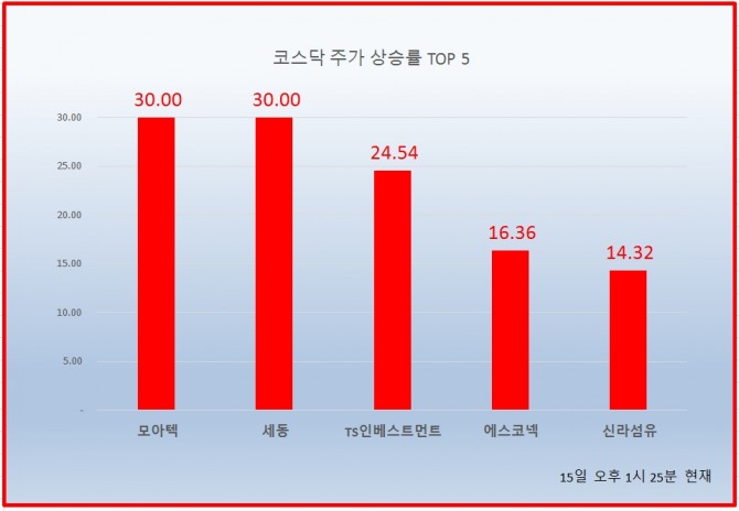 1위 모아텍 18200원 ( 30% ), 2위 세동 793원 ( 30% ), 3위 TS인베스트먼트 3400원 ( 24.54% ), 4위 에스코넥 2240원 ( 16.36% ), 5위 신라섬유 2195원 ( 14.32% ), 6위 KNN 2025원 ( 14.08% ), 7위 DSC인베스트먼트 4300원 ( 13.16% ), 8위 디지탈옵틱 854원 ( 13.11% ), 9위 우노앤컴퍼니 4750원 ( 12.29% ), 10위 조광ILI 7410원 ( 11.43% ),