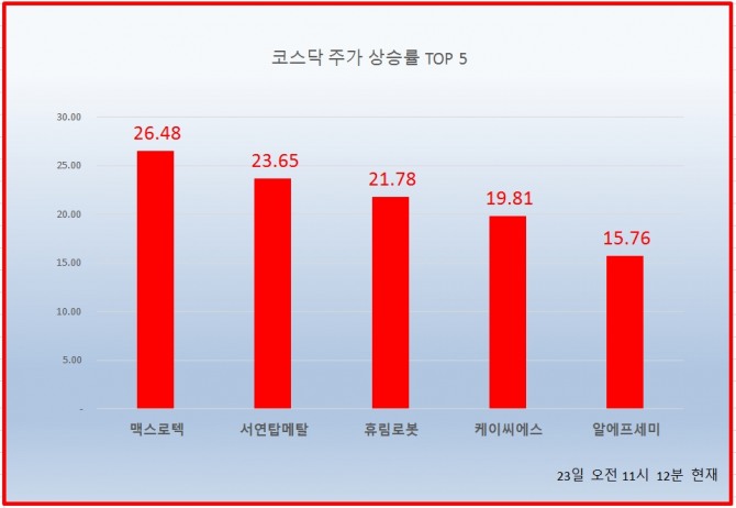 23일 11시 12분 현재 코스닥 상승률 상위 50개 종목은 다음과 같다.