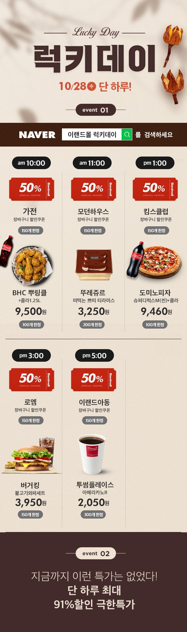 반값쿠폰 행사는 같은 시간대 선착순 150명에 한정해 인기 브랜드 50% 할인 쿠폰을 제공한다. 극한특가 행사는 온종일 최대 91% 할인 혜택을 선사한다.