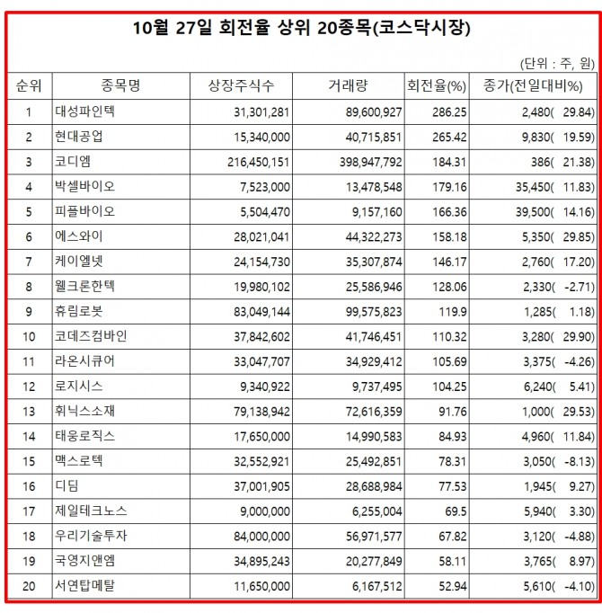 27일 증권시장에서 코스닥 종목의 거래량 회전율 기준 상위 종목은 다음과 같다.