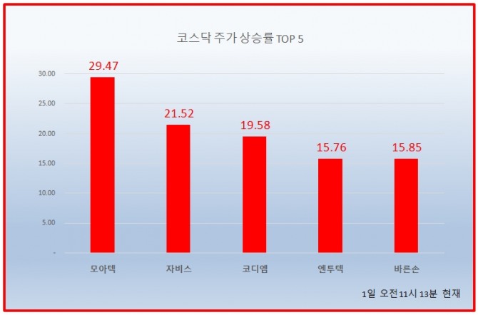 1일 오전 11시 13분 현재 코스닥 상승률 상위 50개 종목은 다음과 같다.